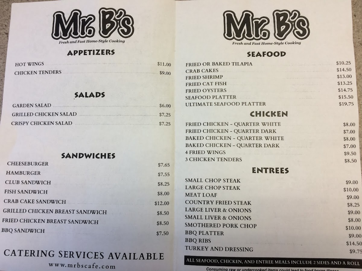 “ My husband and I went to Mr. B's for the first time on Sunday and we were not disappointed. I had the baked chicken, yams and mashed potatoes. My husband had meatloaf, yams, green beans & mashed potatoes. For later, we got the crab cakes and 2 additional sides. I couldn't make up my mind on the desserts so we purchased 4. With all of the food we purchased, it was under 90 and that is unheard of! EVERY item we had were all delicious! I know everyone will have a different experience no matter where we go. BUT Mr. B's food & service were both great to my husband & I. We will definitely return! ”